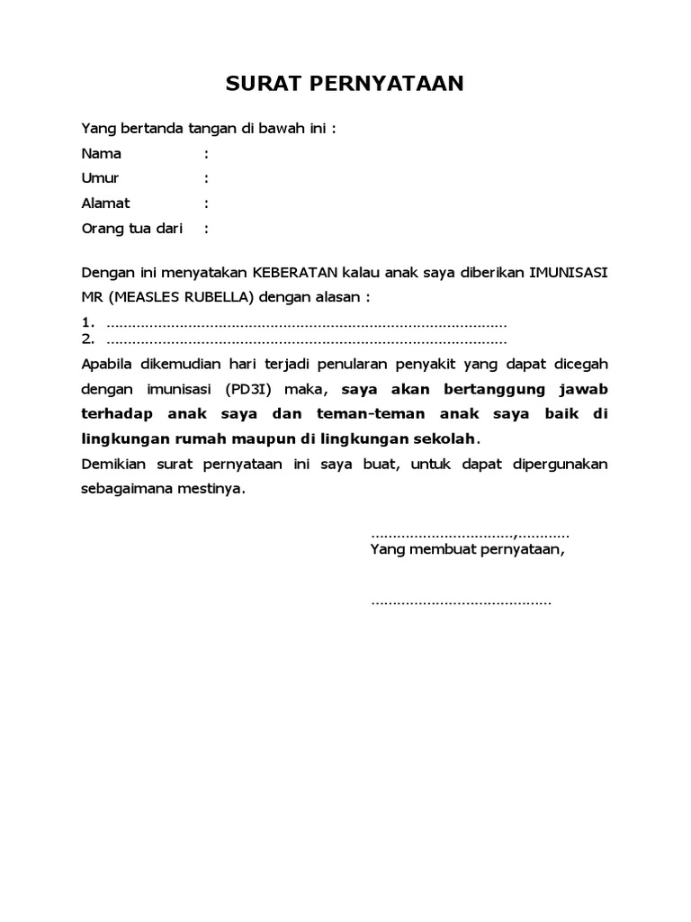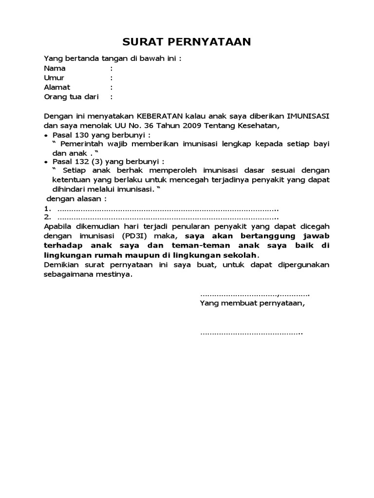 Contoh Surat Pernyataan Penolakan Imunisasi Pdf